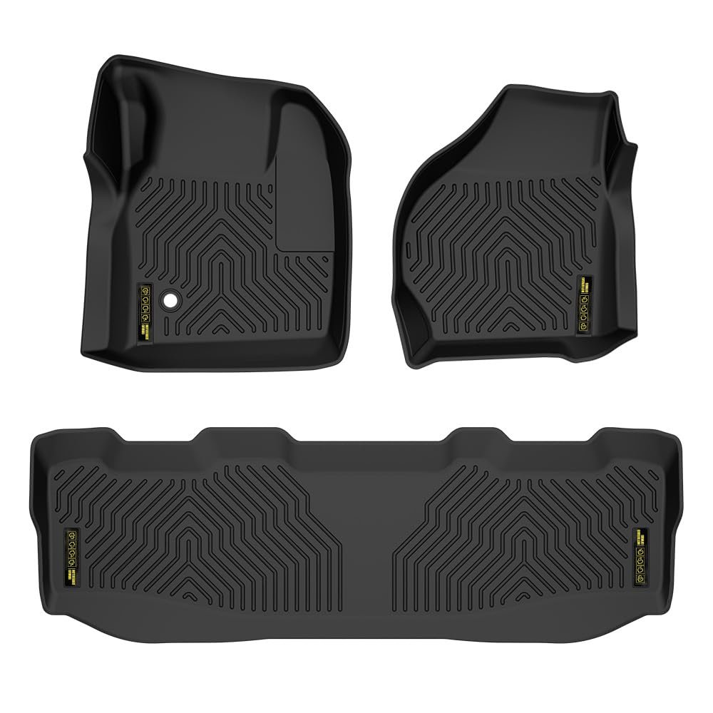 FitmentFloor Mats Compatible with Ford F250 F350 Super Duty CrewCab Models 1999 2000 2001 2002 2003 2004 2005 2006 2007. Not fit Quad Cab and Regular Cab, not fit 2nd row captain seats with center console. ThickPremium TPE automotive floor mats; 3-piece set includes 2 front mats & second row liner. Non-slipGrips on the surface grooves provides robust foot traction, while rubber spikes on the underside ensure non-slippery stability. DependabilityThe fit ford f250 f350 floor cargo liners, are suitable for -20 to 75 degree environments. And it won't crack, split or bend in harsh weather conditions. Highly conformableThe floor mats stay firmly in place during aggressive driving, acceleration, or braking. All-weather protectionThe all weather car floor mats liners fit ford f250 f350 protect agaist spills, debris, rain, snow, slush, mud, etc. All TPE materialOur floor mats,fit ford f250 f350, combine the qualities of rubber(high elasticity) and plastic(easy to process). It comes with GRS certification issued by the Intertek.Other fine products