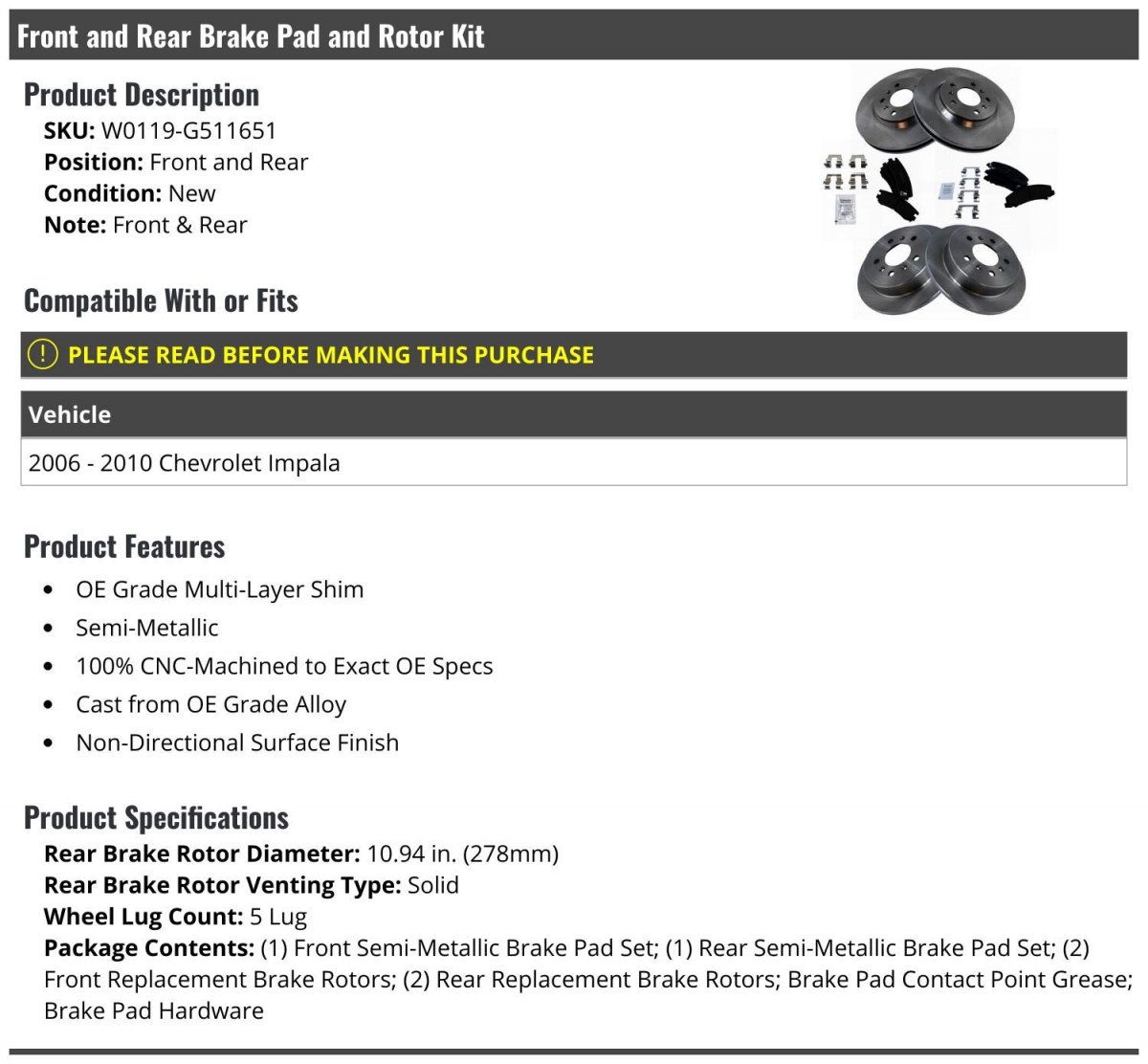 Front and Rear. Compatible with or fits: 2006 - 2010 Chevy Impala. OE Grade Multi-Layer Shim Semi-Metallic 100% CNC-Machined to Exact OE Specs Cast from OE Grade Alloy Non-Directional Surface Finish. Rear Brake Rotor Diameter: 10.94 in. (278mm); Rear Brake Rotor Venting Type: Solid; Wheel Lug Count: 5 Lug; Package Contents: (1) Front Semi-Metallic Brake Pad Set; (1) Rear Semi-Metallic Brake Pad Set; (2) Front Replacement Brake Rotors; (2) Rear Replacement Brake Rotors; Brake Pad Contact Point Grease; Brake Pad Hardware. Front and Rear Brake Pad and Rotor Kit.Other fine products