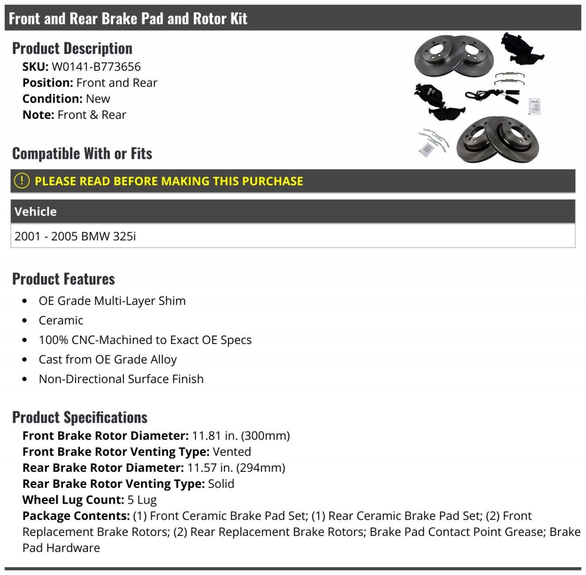 Front & Rear. Compatible with or fits: 2001 - 2005 BMW 325i. OE Grade Multi-Layer Shim Ceramic 100% CNC-Machined to Exact OE Specs Cast from OE Grade Alloy Non-Directional Surface Finish. Front Brake Rotor Diameter: 11.81 in. (300mm); Front Brake Rotor Venting Type: Vented; Rear Brake Rotor Diameter: 11.57 in. (294mm); Rear Brake Rotor Venting Type: Solid; Wheel Lug Count: 5 Lug; Package Contents: (1) Front Ceramic Brake Pad Set; (1) Rear Ceramic Brake Pad Set; (2) Front Replacement Brake Rotors; (2) Rear Replacement Brake Rotors; Brake Pad Contact Point Grease; Brake Pad Hardware. Front and Rear Brake Pad and Rotor Kit.Other fine products