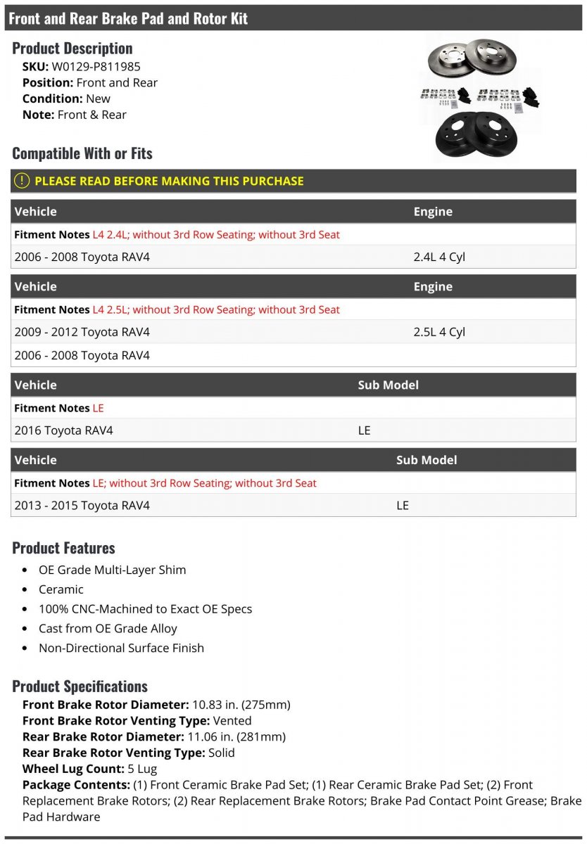 Front & Rear. Compatible with or fits: (Note: L4 2.4L; without 3rd Row Seating; without 3rd Seat; 2006 - 2008 Toyota RAV4 2.4L 4 Cyl) (Note: L4 2.5L; without 3rd Row Seating; without 3rd Seat; 2009 - 2012 Toyota RAV4 2.5L 4 Cyl 2006 - 2008 Toyota RAV4) (Note: LE; 2016 Toyota RAV4 LE) (Note: LE; without 3rd Row Seating; without 3rd Seat; 2013 - 2015 Toyota RAV4 LE). OE Grade Multi-Layer Shim Ceramic 100% CNC-Machined to Exact OE Specs Cast from OE Grade Alloy Non-Directional Surface Finish. Front Brake Rotor Diameter: 10.83 in. (275mm); Front Brake Rotor Venting Type: Vented; Rear Brake Rotor Diameter: 11.06 in. (281mm); Rear Brake Rotor Venting Type: Solid; Wheel Lug Count: 5 Lug; Package Contents: (1) Front Ceramic Brake Pad Set; (1) Rear Ceramic Brake Pad Set; (2) Front Replacement Brake Rotors; (2) Rear Replacement Brake Rotors; Brake Pad Contact Point Grease; Brake Pad Hardware. Front and Rear Brake Pad and Rotor Kit.Other fine products