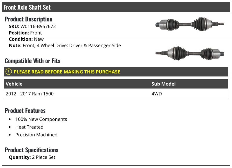 Front; 4 Wheel Drive; Driver & Passenger Side Axle Shaft Set of 2. Compatible with or fits: 2012 - 2017 Ram 1500 4WD. 100% New Components. Heat Treated. Precision Machined.