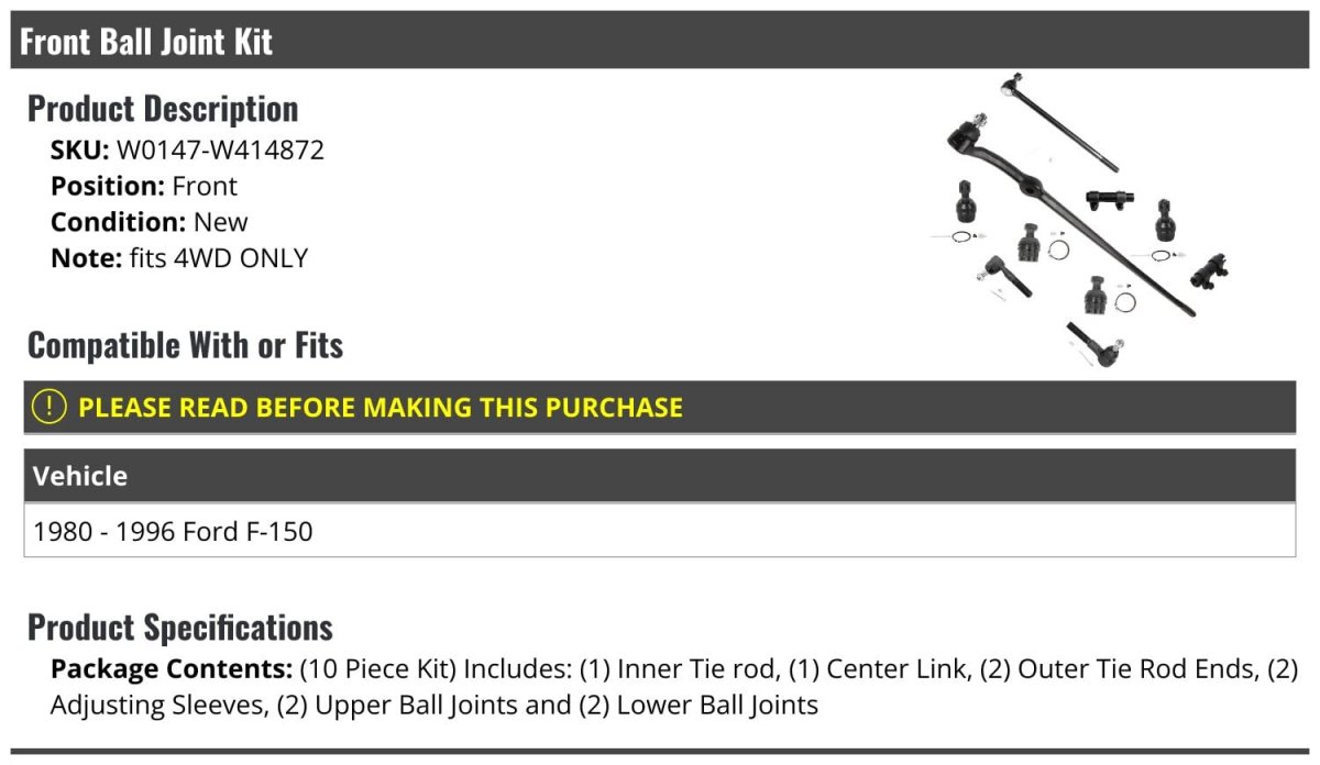 Compatible with or fits: 1980 - 1996 Ford F-150. Fits 4WD Only. Package Contents: (10 Piece Kit) Includes: (1) Inner Tie Rod End - (1) Center Link - (2) Outer Tie Rod Ends - (2) Adjusting Sleeves - (2) Upper Ball Joints - (2) Lower Ball Joints. Position: Front. Review Description to Ensure Proper Fit.Other fine products
