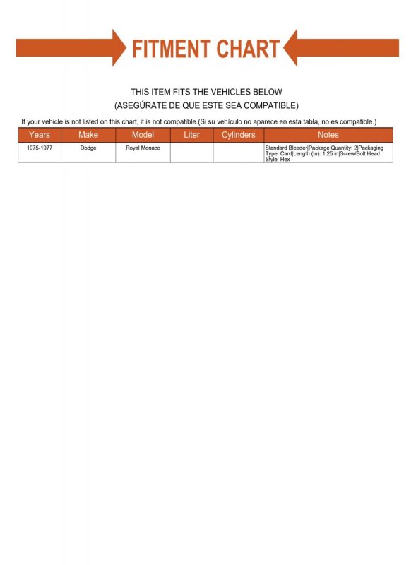 Fitment Notes: Standard BleederPackage Quantity: 2Packaging Type: CardLength (In): 1.25 inScrewith Bolt Head Style: HexPosition Location: Front. Designed with the latest software and manufactured with modern tooling. Direct fit replacement. Installs the same as factory unit. Same dimensions as OE part.Other fine products