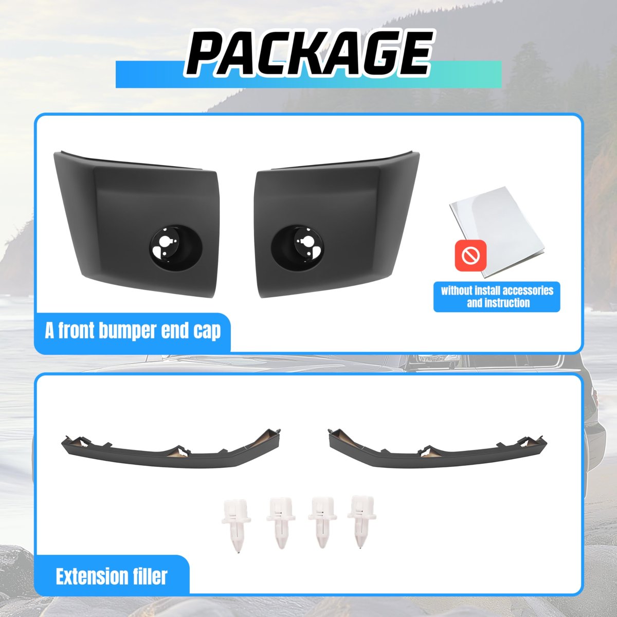 Fitment: Compatible with 2004 Nissan Pathfinder Armada LE, 2004 Nissan Pathfinder Armada SE, 2004-2007 Nissan Titan LE, 2004-2007 Nissan Titan SE, 2004-2007 Nissan Titan XE, 2005-2007 Nissan Armada SE Off-Road, 2005-2007 Nissan Armada LE, 2005-2007 Nissan Armada SE.. Material: Manufactured in plastic with painted surface finished, wear-resistant, reliable, high strength, good impact resistance, better anti-aging performance.. Package Contain: You will receive 1 Pair of Front Bumper End Cap and 1 Pair of Extension Filler. No hardware and instructions were installed.. Installation: Simple bolt-on and snap-on installation. Professional installation is highly recommended.. Replacement: Replace for 622347S300 622357S300 620247S220 620257S220 NI1089106 NI1088106 NI1005147 NI1004147..Other fine products