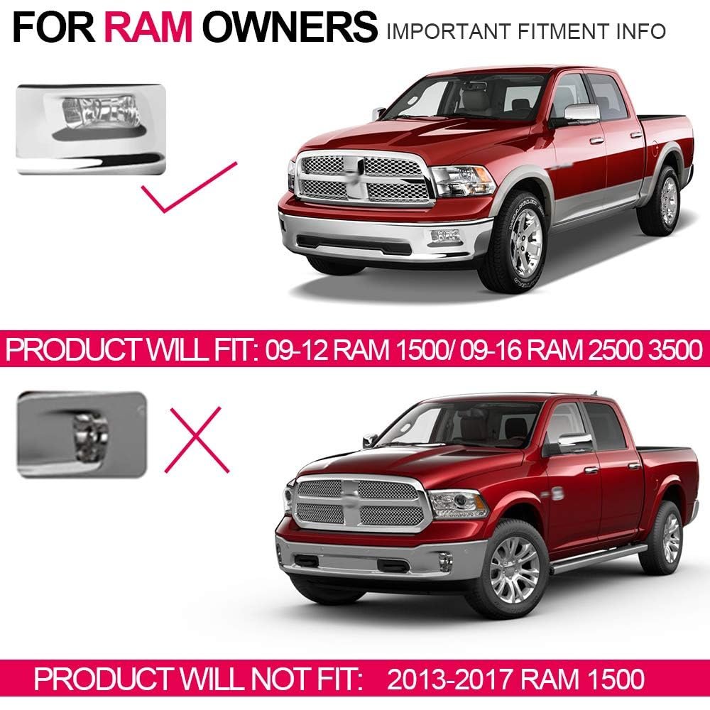 COMPATIBILITY: Front Bumper Fog Lights Compatible with Dodge Ram 1500 2009-2012; Compatible with Dodge Ram 2500 3500 2010-2012. OE STANDARD: Meets the Original Equipment (OE) standards, ensuring replacement fit just like the original.Reference part number:55372735AA CH2594102 55372734AA CH2595102. DURABLE CONSTRUCTION: The fog lights are made to withstand the most rigorous weather conditions and prevent moisture and dust from getting inside the housing. BRIGHT ILLUMINATION: With H10 light bulbs included. Allow you to see and be seen by oncoming drivers even through a thick fog.Ideal for showcasing use or replacing old and worn fog lights. INSTALLATION: Bolt-on style bumper fog lights are designed for quick and easy installation.Including Passenger& Driver sides.Other fine products