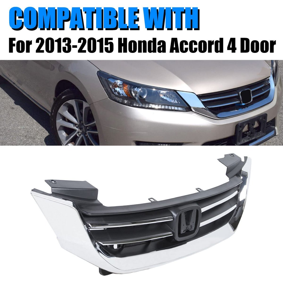 Fitment: Front Bumper Hood Grille Grill Compatible with 2013-2015 Honda Accord 4d Replaces for 71121T2FA01, HO1200214.. Accentuates your vehicles overall look.This replacement grill enables air flow into your vehicle to cool down your radiator and engine, while making it look as good as new. This is an affordable direct fit OE comparable replacement for the damaged part.. Quality Assured: Durable construction. Made of automotive grade ABS plastic with a black & chrome finish for Strength and Durability.. Good Fit : Full grill replacement, NOT a cover.. Installation: Uses the cars existing bolts to install. Product does not come with installation instructions, professional assembly is highly recommended..