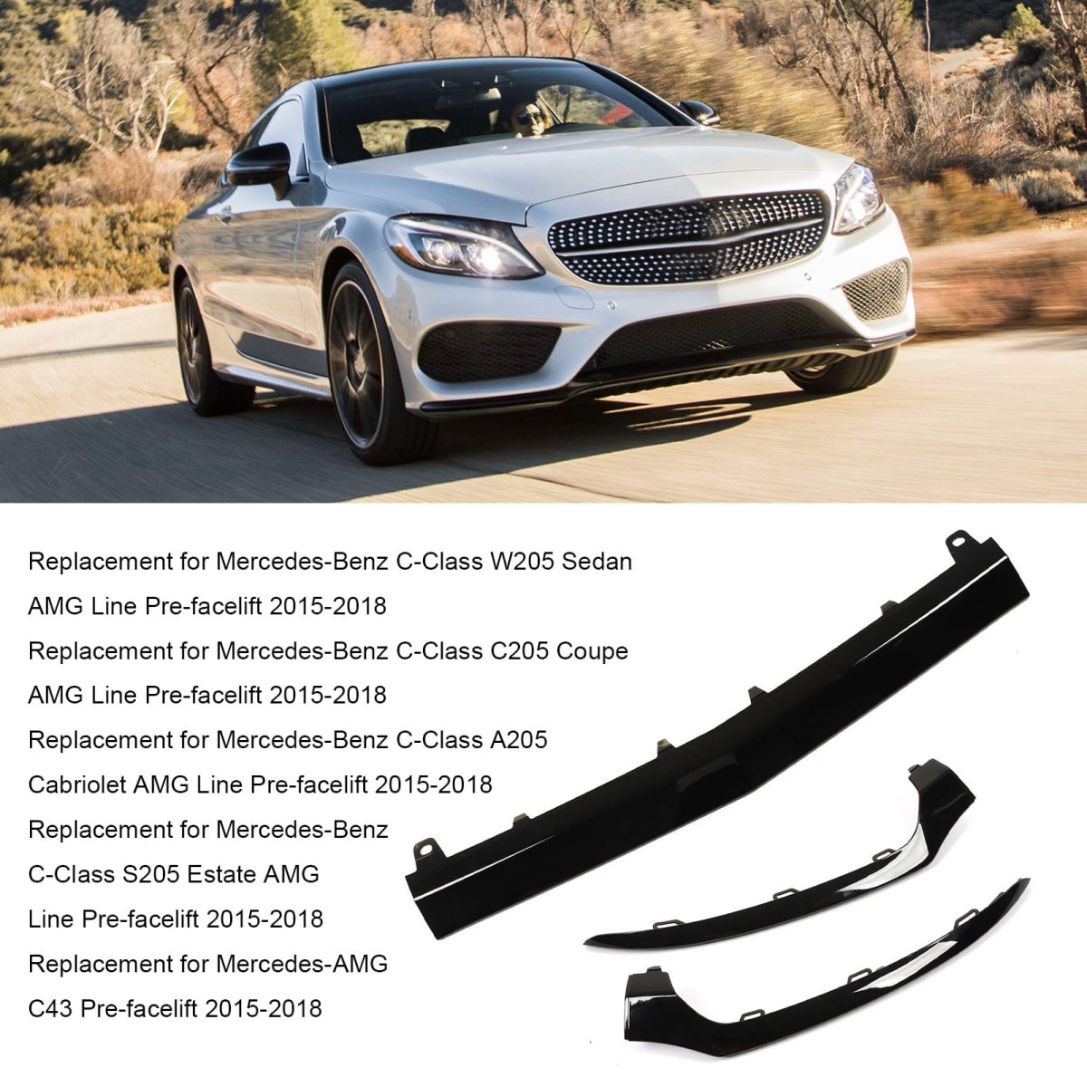 [Easy Installation] These trims feature a design for convenient replacement of scratched or damaged front bumper trims. no complicated tools or professional installation required.. [Good Replacement] This front bumper lower trims are specifically designed for c-class w205 sedan, c205 coupe, cabriolet, estate, and c43 model from 2015-2018. ensure compatibility before purchasing.. [Enhance Your Car] The colorfast gloss black trims add a unique touch to your vehicle, perfectly complementing its design. stand out on the road with these and stylish accessories.. [Accessory] Upgrade your car's appearance with these front bumper lower trims. enhance the overall aesthetic appeal and make a statement with this aftermarket addition.. [Premium Material] Crafted from stable abs material, these trims offer excellent impact and scratch resistant. the gloss black finish with a layer enhances the car's sporty and cool look..Other fine products
