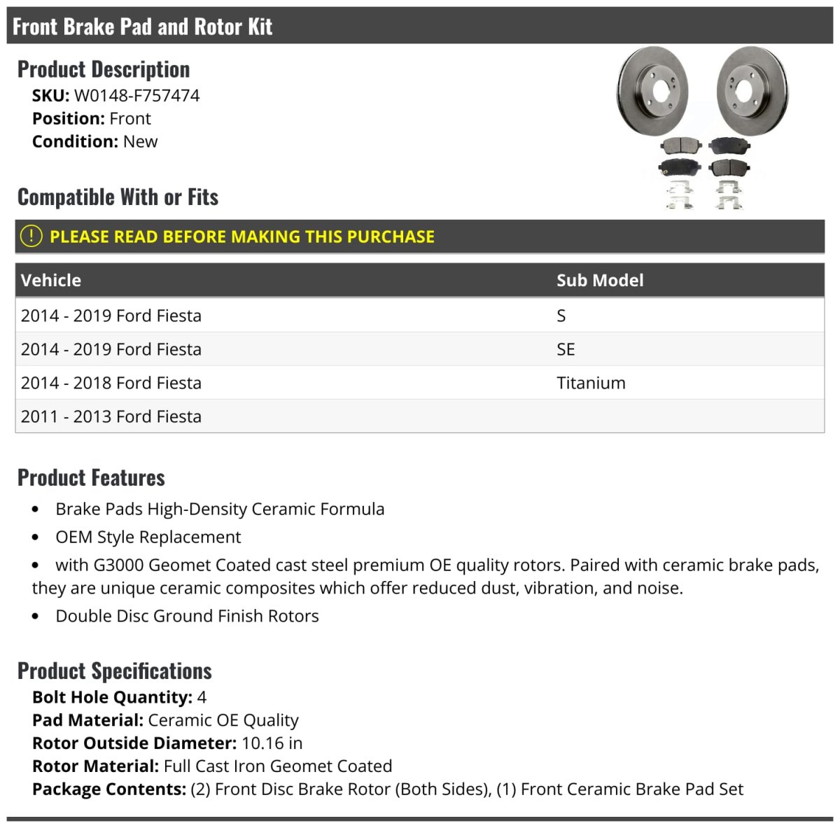 Compatible with or fits: 2014 - 2019 Ford Fiesta S 2014 - 2019 Ford Fiesta SE. Compatible with or fits: 2014 - 2018 Ford Fiesta Titanium 2011 - 2013 Ford Fiesta. OEM Style Replacement - Brake Pads High-Density Ceramic Formula. with G3000 Geomet Coated cast steel premium OE quality rotors. Paired with ceramic brake pads, reduced dust, vibration, and noise.. Double Disc Ground Finish Rotors.Other fine products