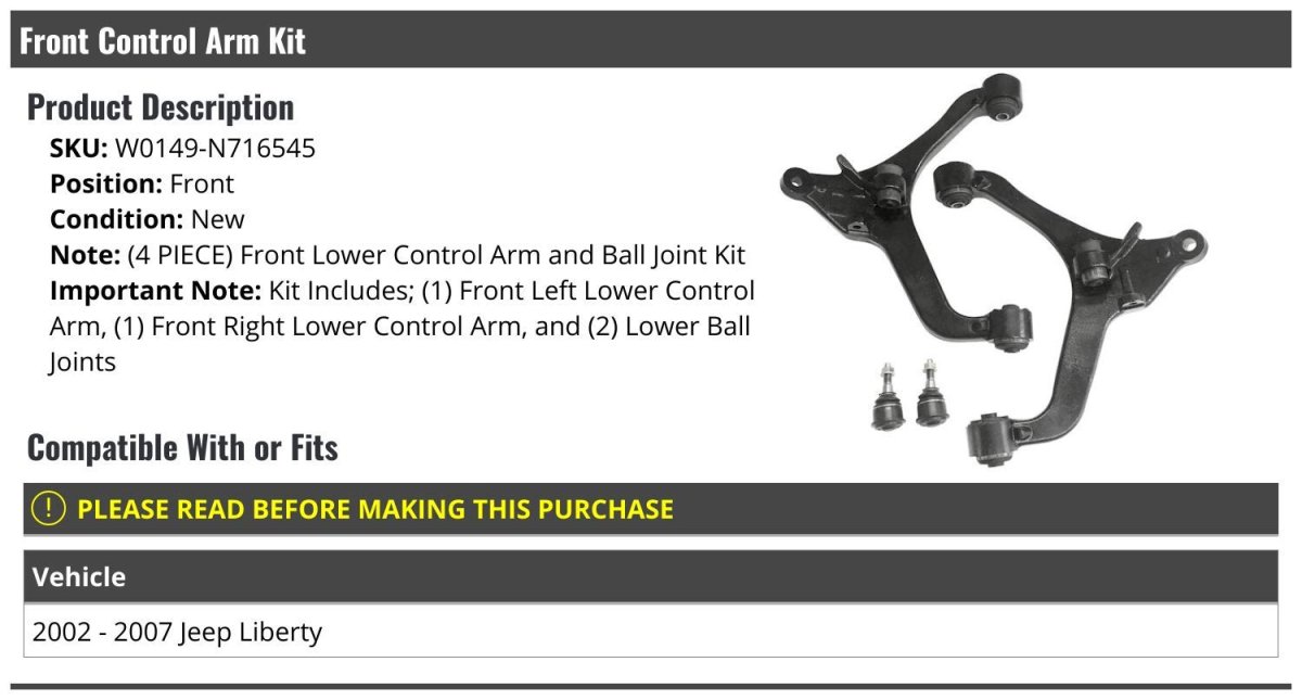 (4 PIECE) Front Lower Control Arm and Ball Joint Kit. Kit Includes; (1) Front Left Lower Control Arm, (1) Front Right Lower Control Arm, and (2) Lower Ball Joints. Compatible with or fits: 2002 - 2007 Jeep Liberty. Front Control Arm Kit. Review Description to Ensure Proper Fit.