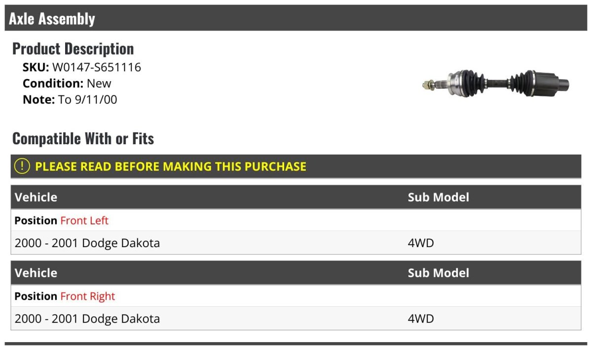 - Front Cv Axle Assembly For 2000-2001 Dodge Dakota 4wd Fits Up To 9 11 2000 Vehicle Production