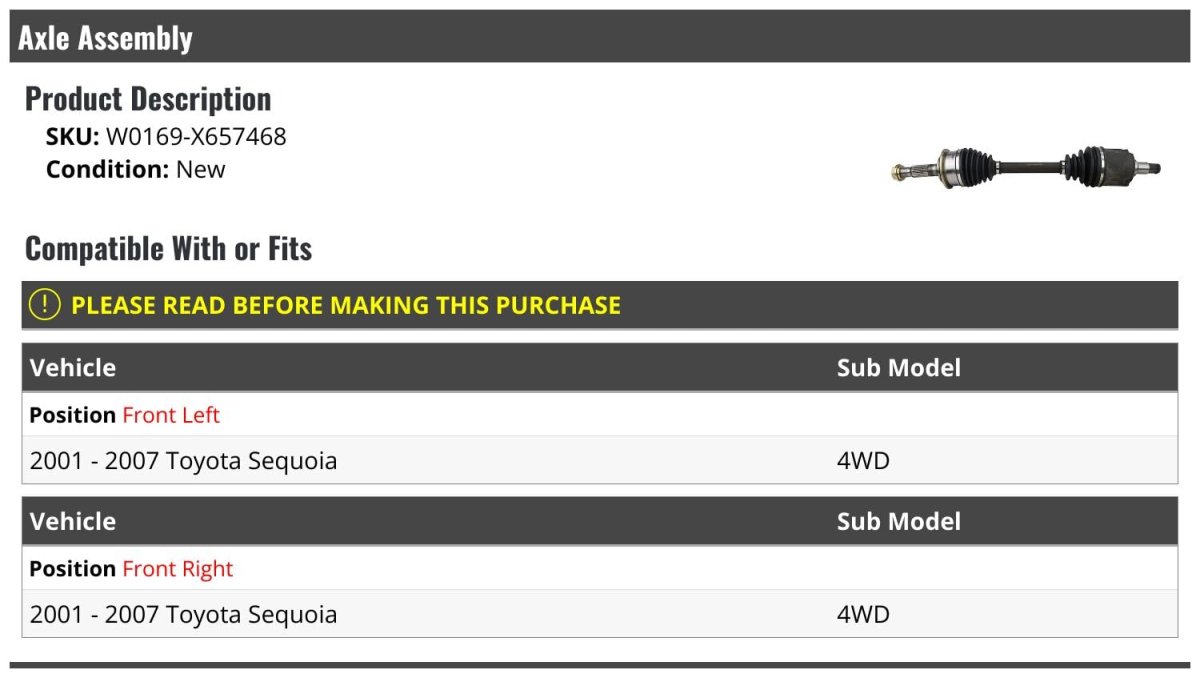 - Front Cv Axle Assembly For 2001-2007 Toyota Sequoia 4wd