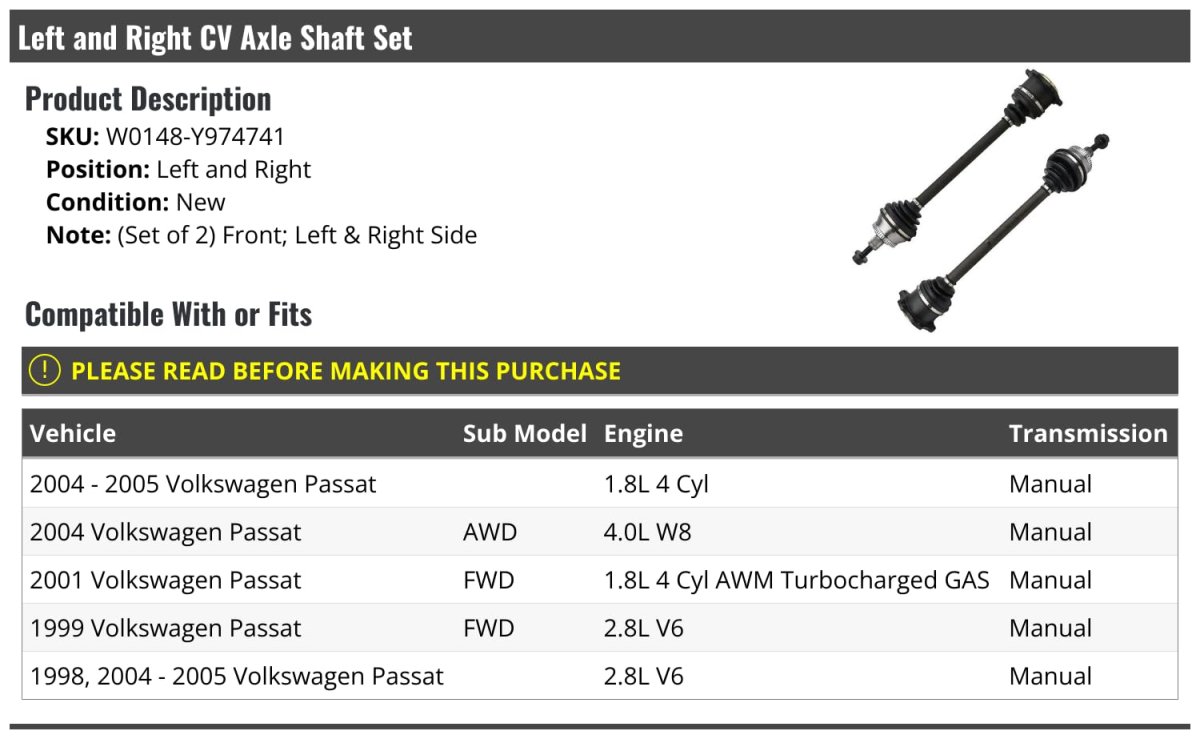 - Front Cv Axle Shaft Set Of 2 For 1998-1999 2001 2004-2005 Volkswagen Passat Manual Transmission