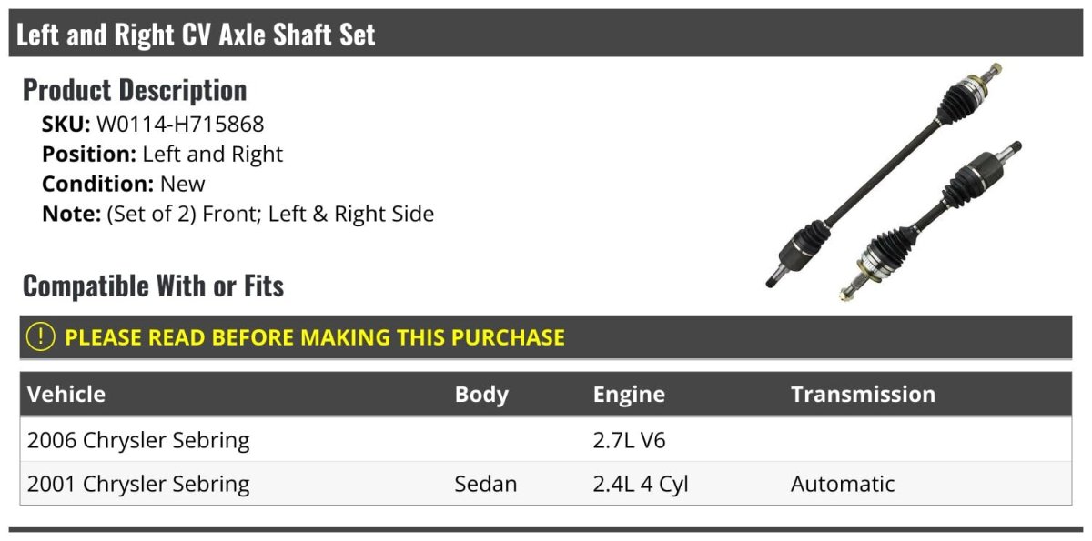 - Front Cv Axle Shaft Set Of 2 For 2001 2006 Chrysler Sebring Sedan