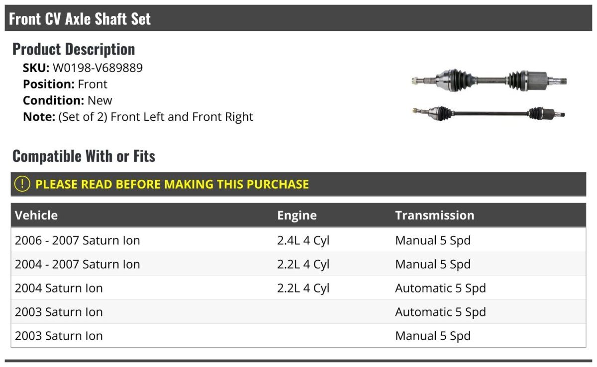 - Front Cv Axle Shaft Set Of 2 For 2003-2007 Saturn Ion