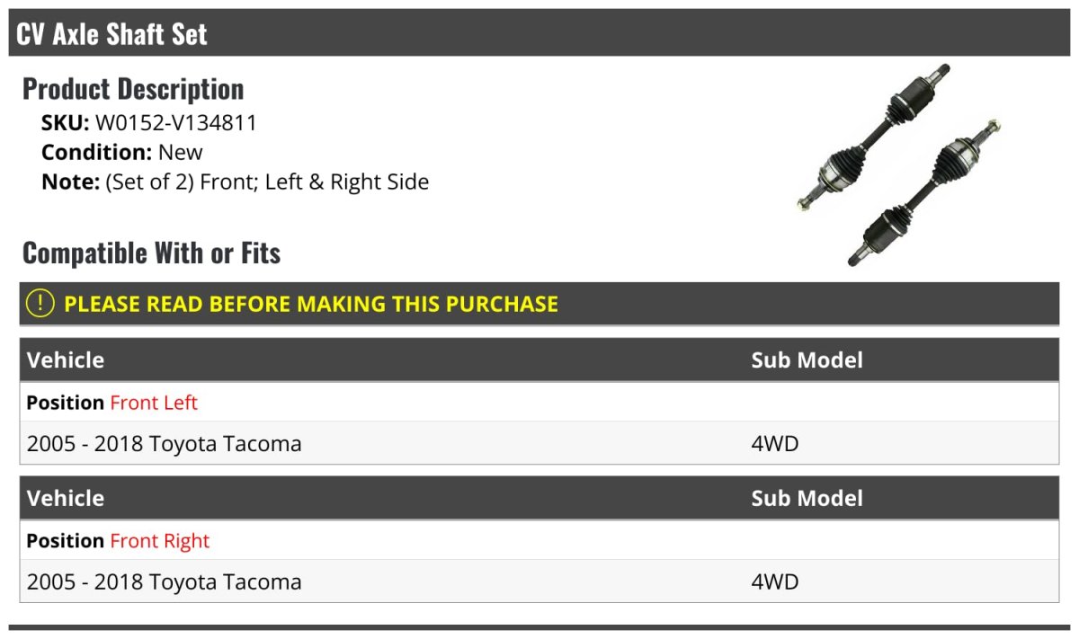 - Front Cv Axle Shaft Set Of 2 For 2005-2018 Toyota Tacoma 4wd