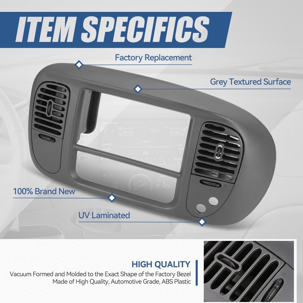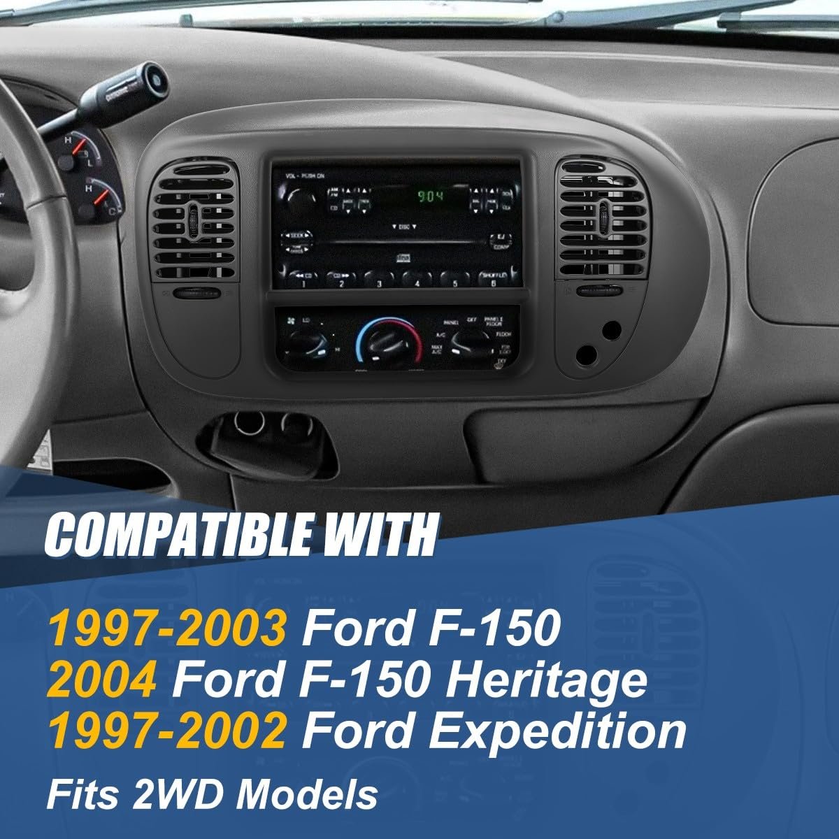 Vehicle Compatibility - Dash panel bezel compatible with Ford F-150 1997-2003, Ford F-150 Heritage 2004, Ford Expedition 1997-2002, fits 2WD models.. Great Protection - Come with [1] molded dash cover panel bezel with UV laminated to help protect against damage from sun exposure, can make the replacement for upgrade appearance of vehicle with a visually striking presence.. Reliable Product - Owning the vacuum formed and molded dash cover to the exact shape of the factory bezel, can directly install OVER the original to cover cracks, scratches or other damage.. Easy and Quick to Install - Plug-n-play operation, direct OE fitment and replacement for factory unit, easy to install with included clips, without any drilling or modification..Other fine products