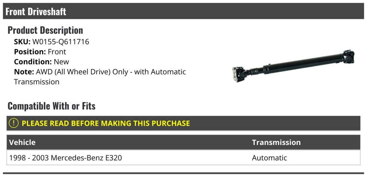 AWD (All Wheel Drive) Only - with Automatic Transmission. Compatible with or fits: 1998 - 2003 Mercedes-Benz E320 Automatic. Front Driveshaft. Review Description to Ensure Proper Fit. OE Quality.