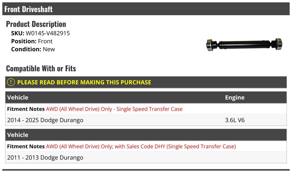- Front Driveshaft For 2011-2025 Dodge Durango 3 6l V6 Awd