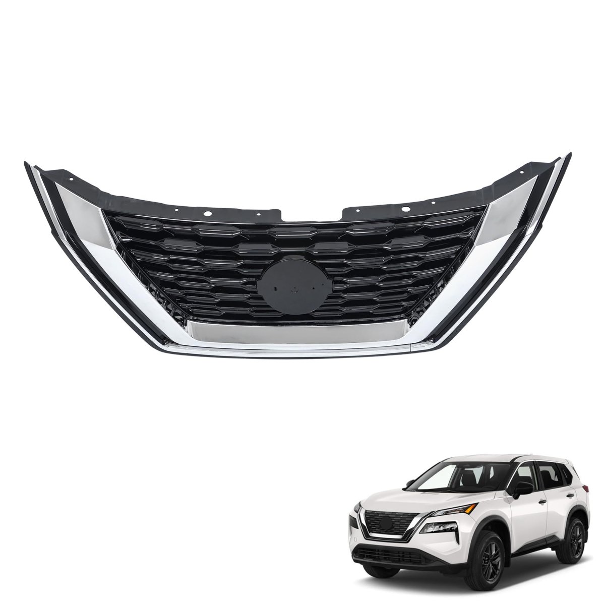 - Front Grille Black Without Camera Hole With Chrome Molding Replacement For Rogue 2021-2023