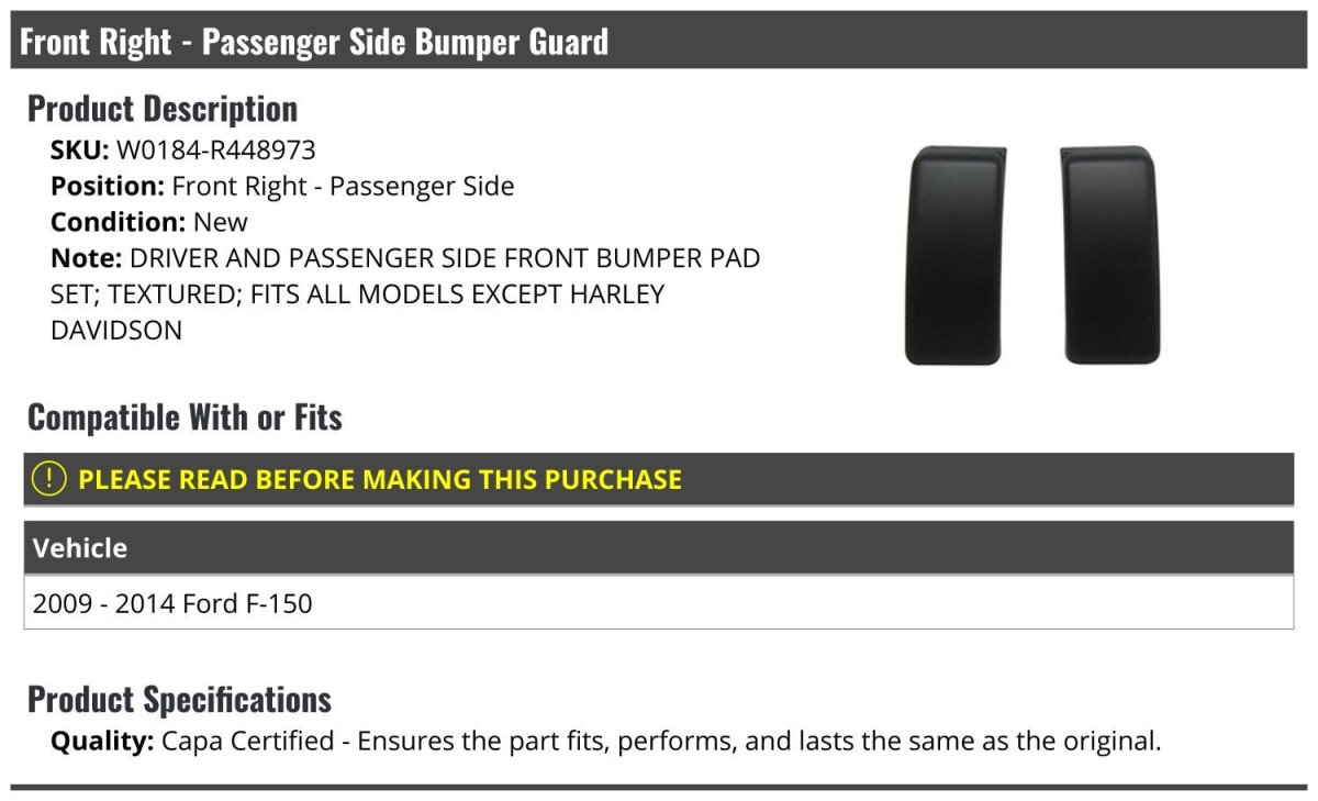 DRIVER AND PASSENGER SIDE FRONT BUMPER PAD SET; TEXTURED; FITS ALL MODELS EXCEPT Hrly-Dvsn. Compatible with or fits: 2009 - 2014 Ford F-150. Quality: Capa Certified - Ensures the part fits, performs, and lasts the same as the original.. Front Right - Passenger Side Bumper Guard. Review Description to Ensure Proper Fit.Other fine products