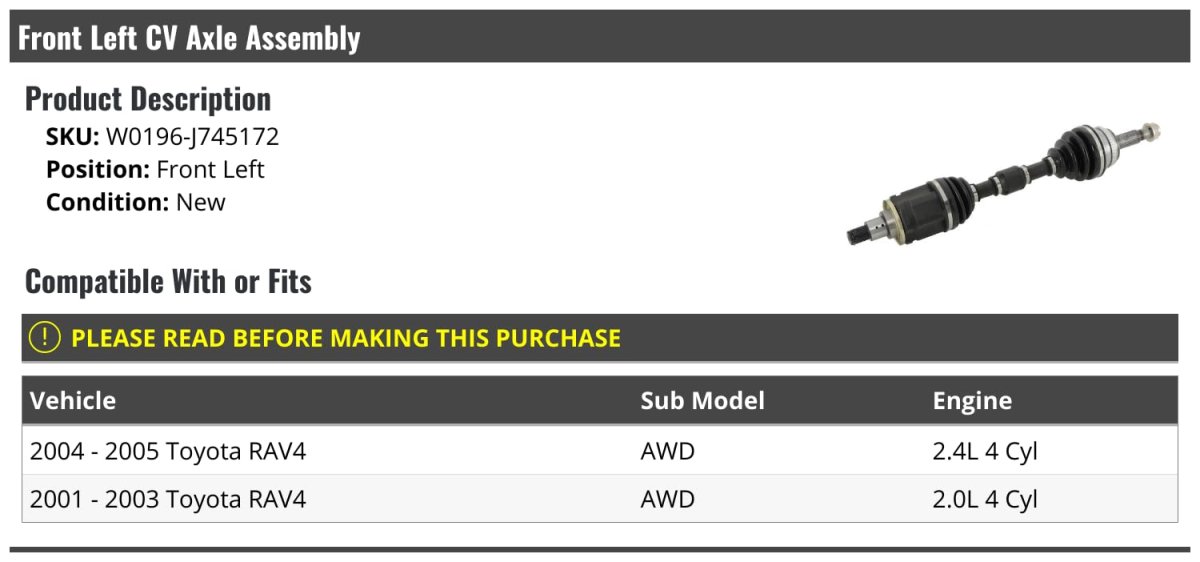 - Front Left Driver Side Cv Axle Assembly For 2001-2005 Toyota Rav4 Awd 4-cylinder