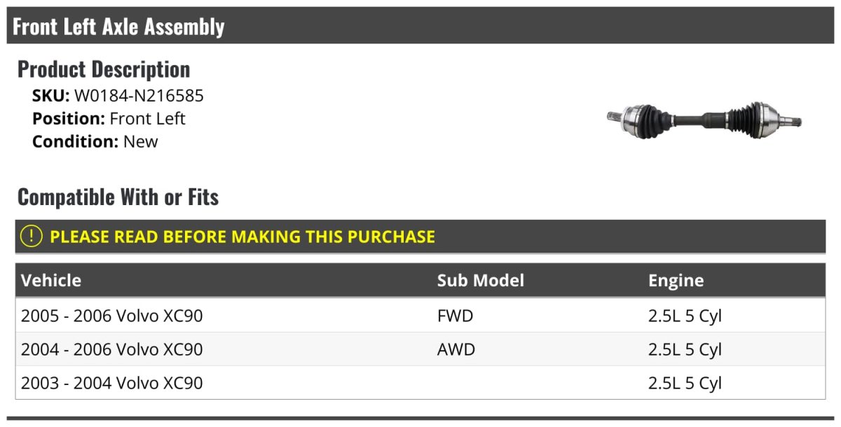 Compatible with or fits: 2005 - 2006 Volvo XC90 FWD 2.5L 5 Cyl. Compatible with or fits: 2004 - 2006 Volvo XC90 AWD 2.5L 5 Cyl. Compatible with or fits: 2003 - 2004 Volvo XC90 2.5L 5 Cyl. (1) Front Left Driver Side CV Axle Assembly. Review Description to Ensure Proper Fit.Other fine products