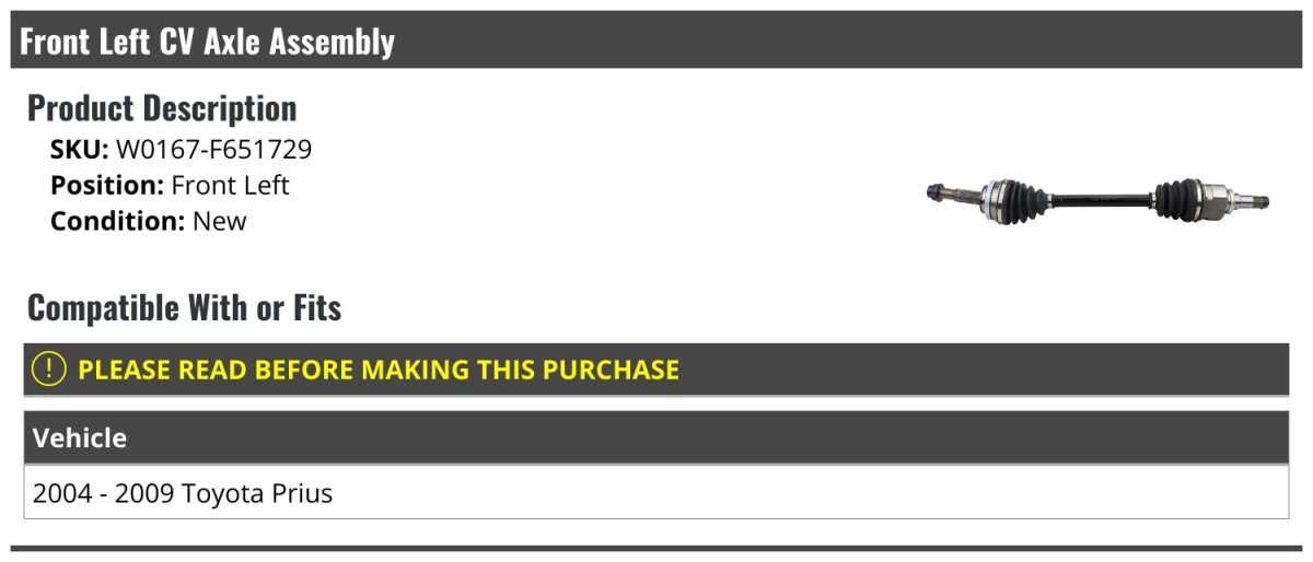 - Front Left Driver Side Cv Axle Assembly For 2004-2009 Toyota Prius