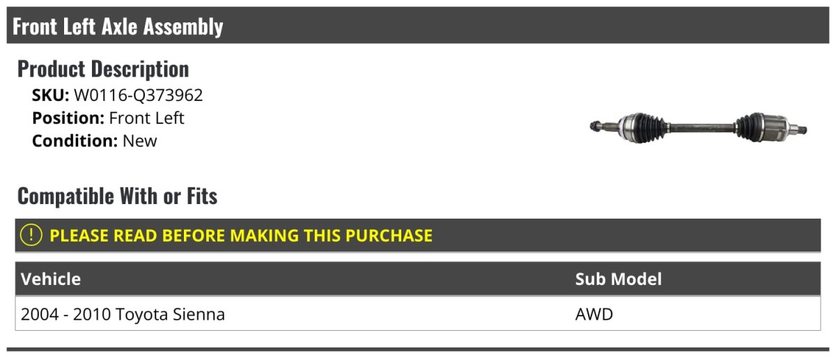 - Front Left Driver Side Cv Axle Assembly For 2004-2010 Toyota Sienna Awd