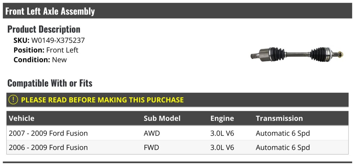 - Front Left Driver Side Cv Axle Assembly For 2006-2009 Ford Fusion 3 0l V6 6-speed Automatic Transmission
