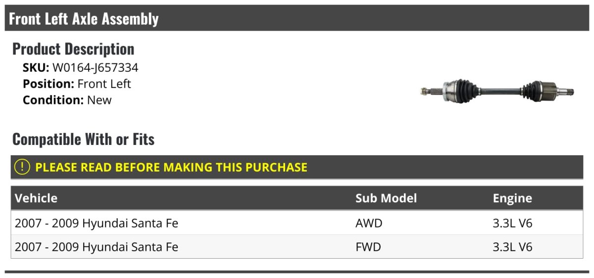 - Front Left Driver Side Cv Axle Assembly For 2007-2009 Hyundai Santa Fe 3 3l V6 Fwd Awd