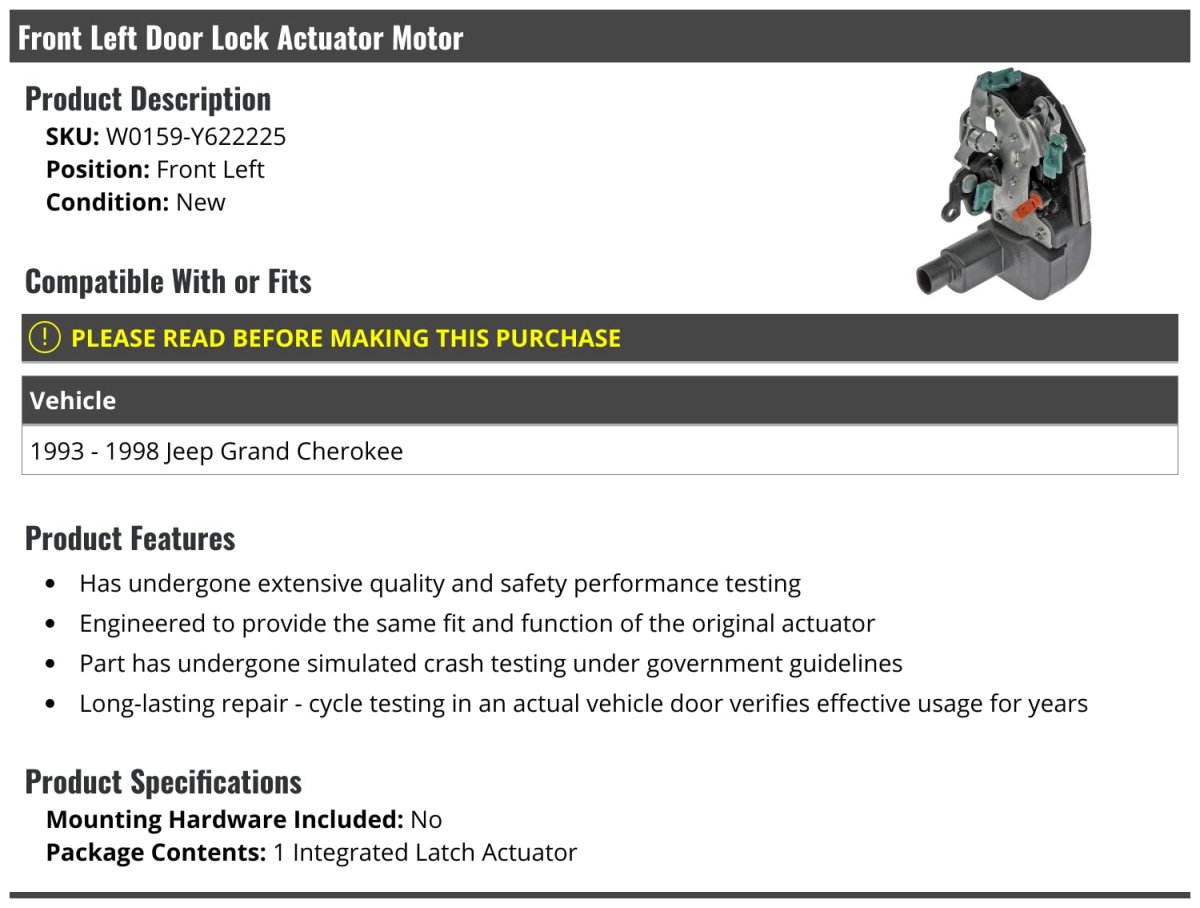 - Front Left Driver Side Door Lock Actuator Motor For 1993-1998 Jeep Grand Cherokee
