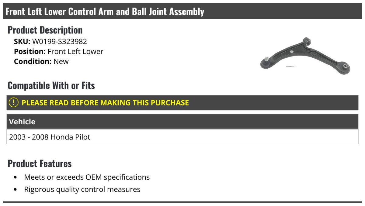 - Front Left Driver Side Lower Control Arm And Ball Joint Assembly For 2003-2008 Honda Pilot