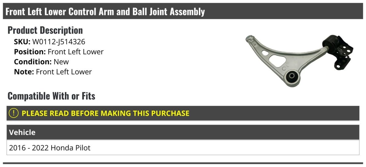 Compatible with or fits: 2016 - 2022 Honda Pilot. Front Left Lower. (1) Front Left Driver Side Lower Control Arm and Ball Joint Assembly. Review Description to Ensure Proper Fit. OE Quality.