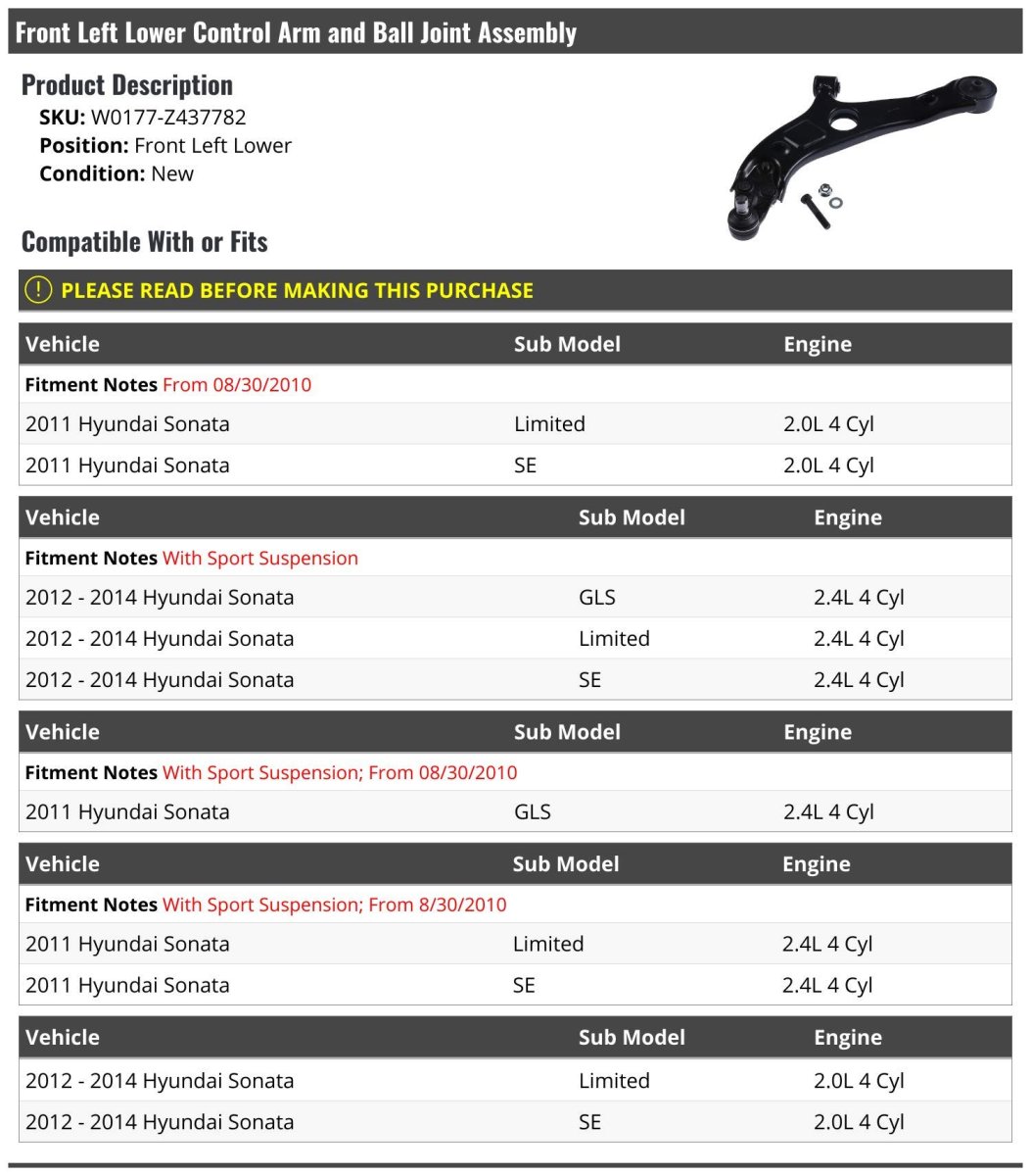 Compatible with or fits: (Note: From 08/30/2010; 2011 Hyundai Sonata Limited 2.0L 4 Cyl 2011 Hyundai Sonata SE 2.0L 4 Cyl). Compatible with or fits: (Note: With Sport Suspension; 2012 - 2014 Hyundai Sonata GLS 2.4L 4 Cyl 2012 - 2014 Hyundai Sonata Limited 2.4L 4 Cyl 2012 - 2014 Hyundai Sonata SE 2.4L 4 Cyl). Compatible with or fits: (Note: With Sport Suspension; From 08/30/2010; 2011 Hyundai Sonata GLS 2.4L 4 Cyl). Compatible with or fits: (Note: With Sport Suspension; From 8/30/2010; 2011 Hyundai Sonata Limited 2.4L 4 Cyl 2011 Hyundai Sonata SE 2.4L 4 Cyl). Compatible with or fits: 2012 - 2014 Hyundai Sonata Limited 2.0L 4 Cyl 2012 - 2014 Hyundai Sonata SE 2.0L 4 Cyl.Other fine products