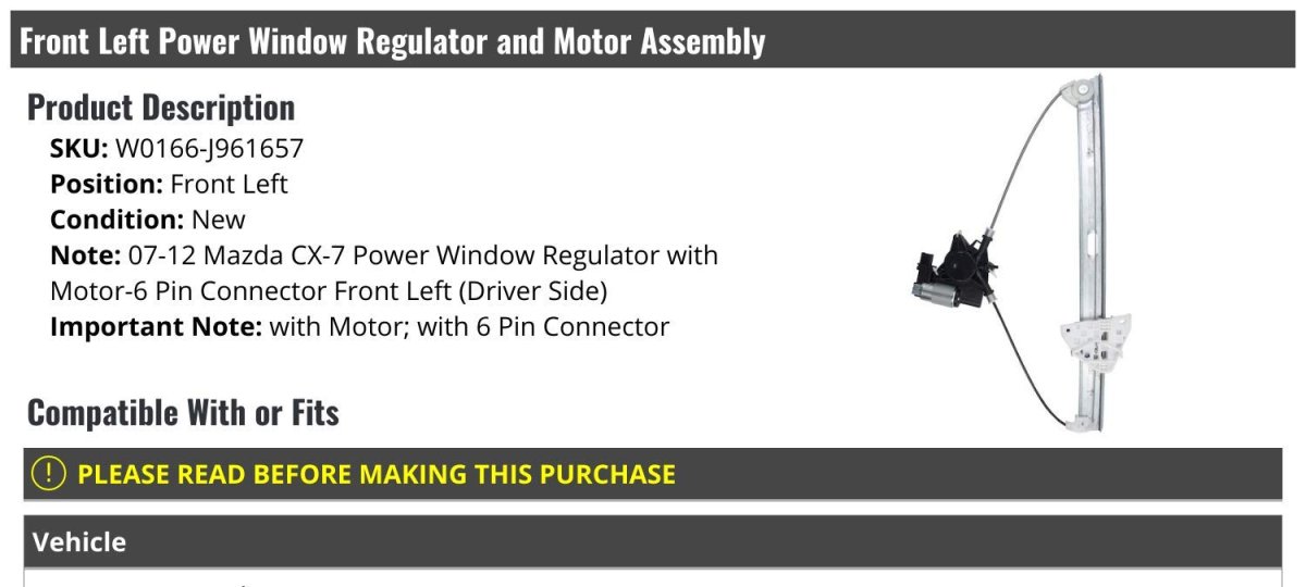 - Front Left Driver Side Power Window Regulator With Motor 6-pin Connector For 2007-2012 Mazda Cx-7