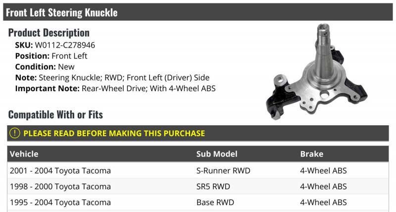 Steering Knuckle; RWD; Front Left (Driver) Side. Rear-Wheel Drive; With 4-Wheel ABS. Compatible with or fits: 2001 - 2004 Toyota Tacoma S-Runner RWD with 4-Wheel ABS 1998 - 2000 Toyota Tacoma SR5 RWD with 4-Wheel ABS 1995 - 2004 Toyota Tacoma Base RWD with 4-Wheel ABS 1995 - 2003 Toyota Tacoma DLX RWD with 4-Wheel ABS. Front Left Steering Knuckle. Review Description to Ensure Proper Fit.Other fine products