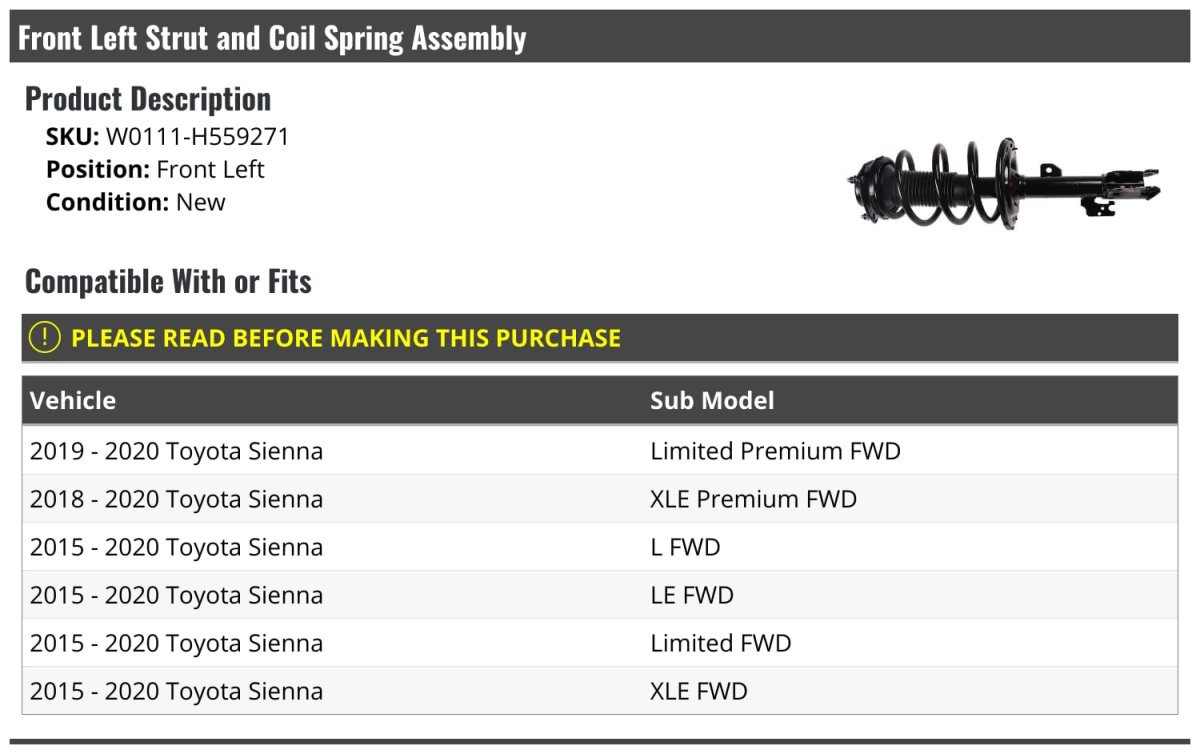 - Front Left Driver Side Strut And Coil Spring Assembly For 2015-2020 Toyota Sienna
