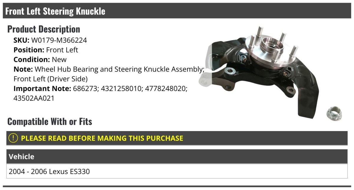 - Front Left Driver Side Wheel Hub Bearing And Steering Knuckle Assembly For 2004-2006 Es330