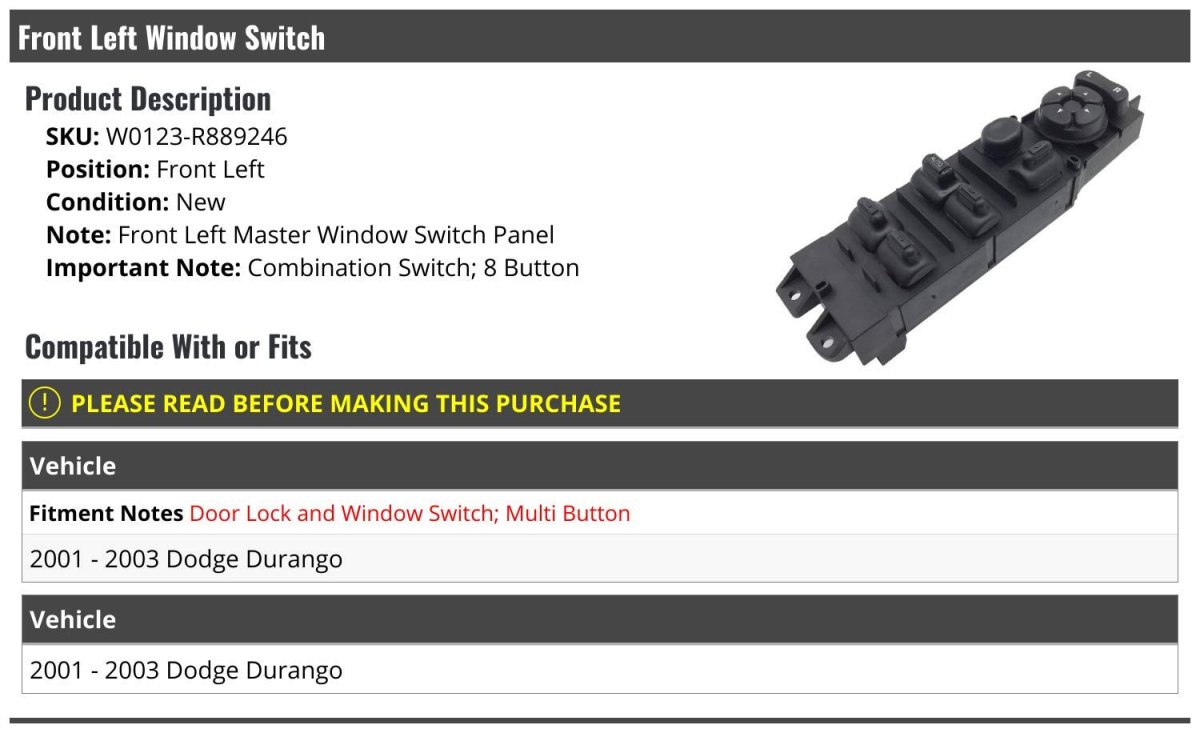 - Front Left Master Window Switch Door Lock Mirror Panel For 2001-2003 Dodge Durango