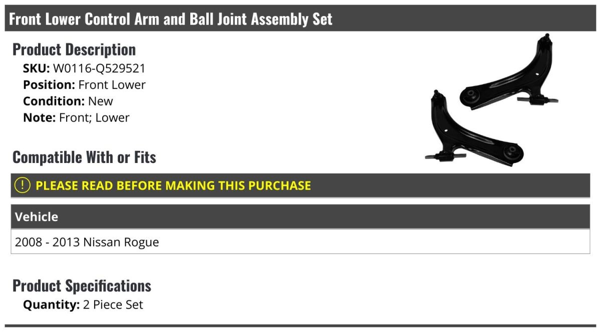 - Front Lower Control Arm And Ball Joint Assembly 2 Piece Set For 2008-2013 Nissan Rogue