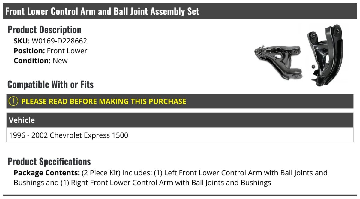 Compatible with or fits: 1996 - 2002 Chevrolet Express 1500. Package Contents: (2 Piece Kit) Includes: (1) Left Front Lower Control Arm with Ball Joints and Bushings and (1) Right Front Lower Control Arm with Ball Joints and Bushings. Front Lower Control Arm and Ball Joint Assembly Set. Review Description to Ensure Proper Fit.Other fine products