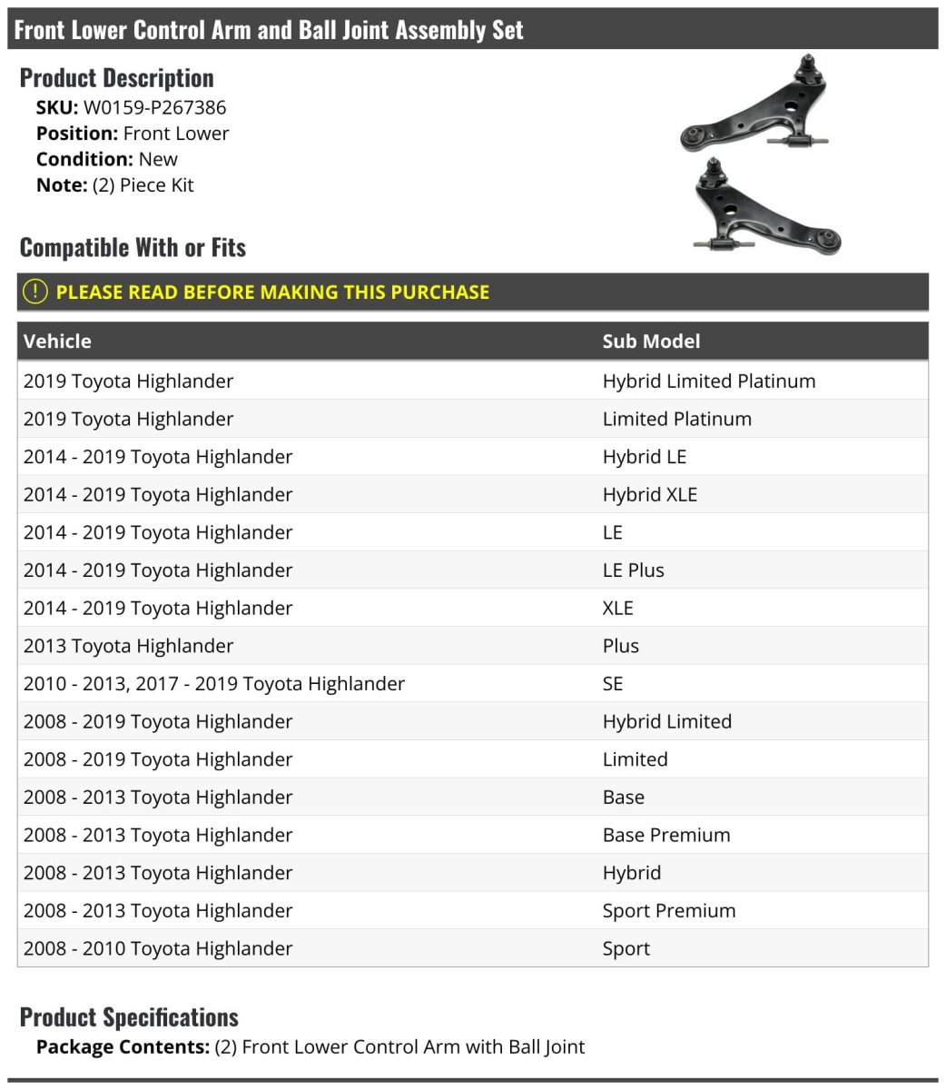 - Front Lower Control Arm And Ball Joint Assembly Set Of 2 For 2008-2019 Toyota Highlander
