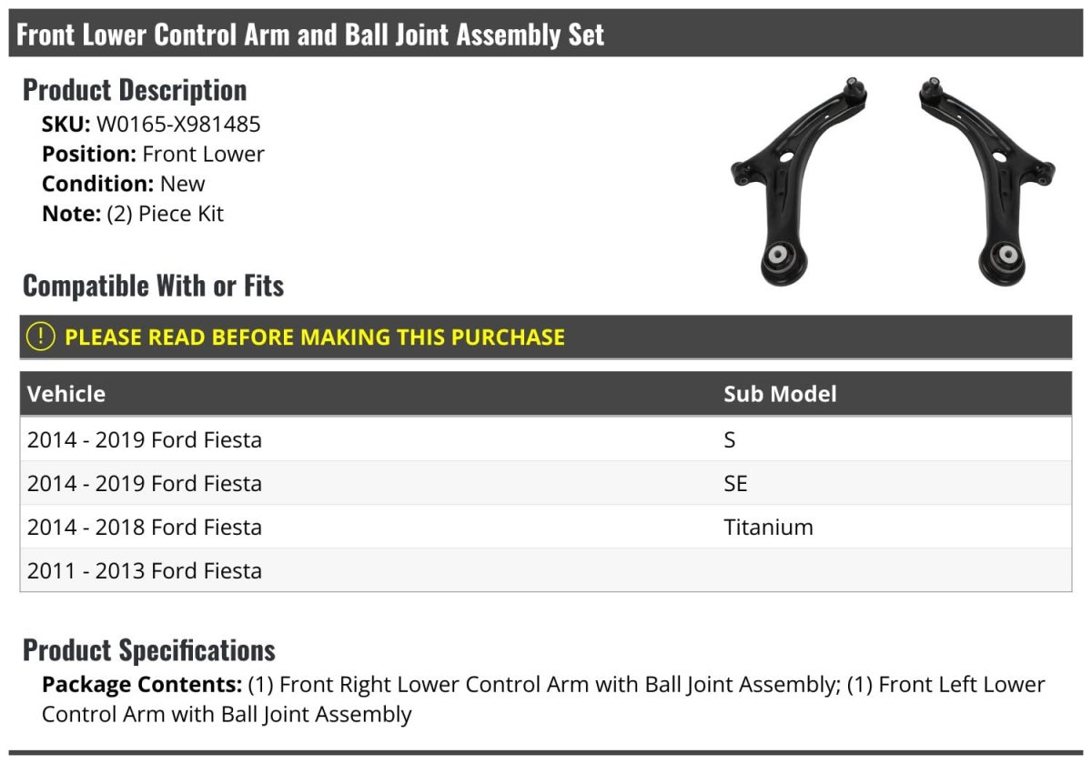 Front Lower Control Arm And Ball Joint Assembly Set Of 2 For 2011-2019 Ford Fiesta Front Lower Control Arm And Ball Joint Assembly Set Of 2 For 2011-2019 Ford Fiesta