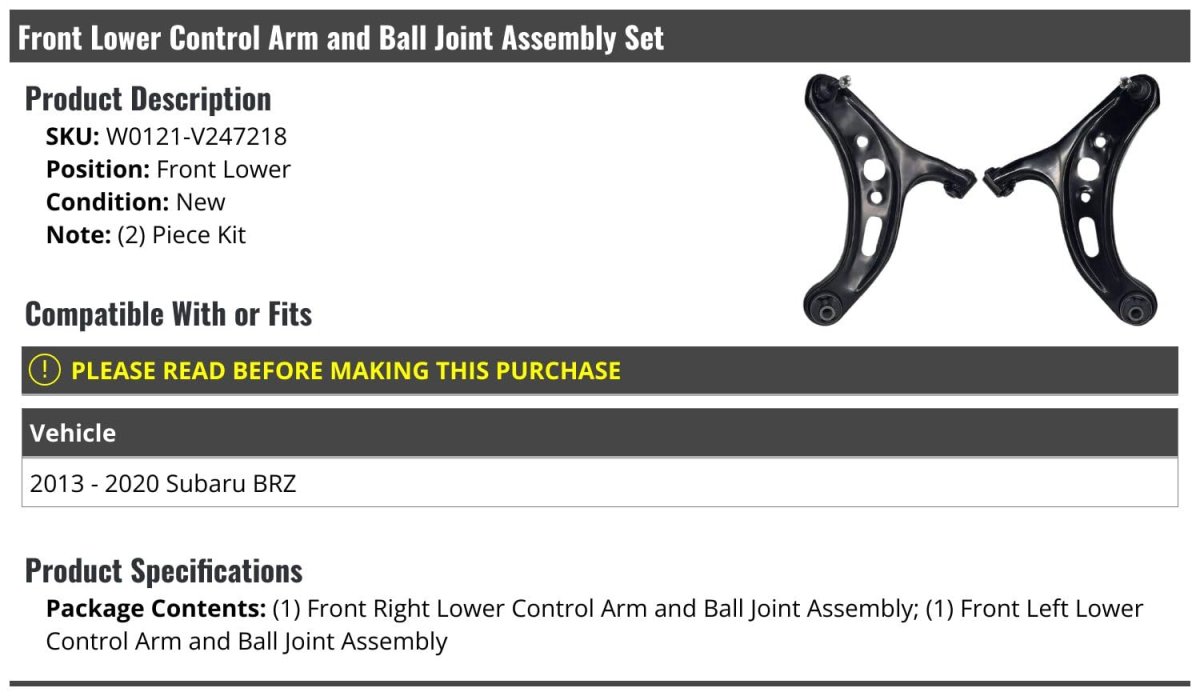 Compatible with or fits: 2013 - 2020 Subaru BRZ. Package Contents: (1) Front Right Passenger Side Lower Control Arm and Ball Joint Assembly; (1) Front Left Driver Side Lower Control Arm and Ball Joint Assembly. OE Quality. Front Lower. Review Description to Ensure Proper Fit.Other fine products