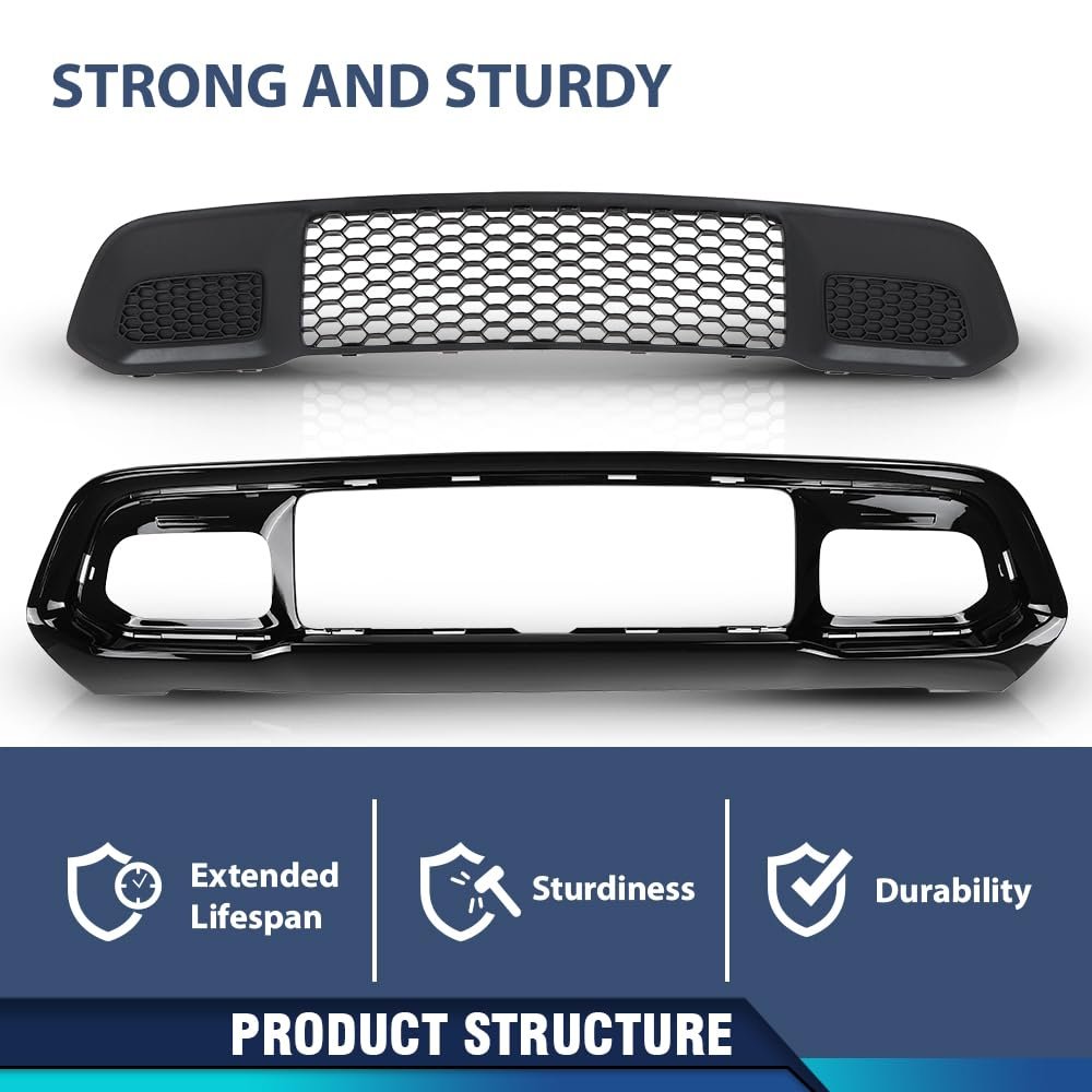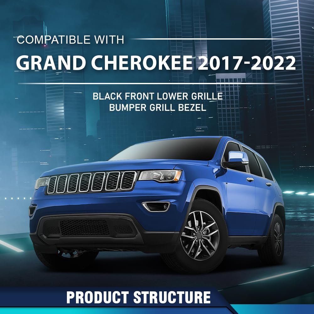 Vehicle Compatibility - Compatible with Jeep Grand Cherokee 2017-2022. OE Standard - Meets the Original Equipment (OE) standards, ensuring replacement fit just like the original. Interchange Part Number: 5ZM53SZ0AA. Material - Made of PC & ABS materials that is resistant to bent, UV, and harsh weather conditions, has long-lasting performance and can maintain its original appearance.. Package Inculded - 1x Black Front Bumper Grille Frame, 1x Front Bumper Lower Grille. Installation - No modification required. Professional installation is highly recommended..Other fine products