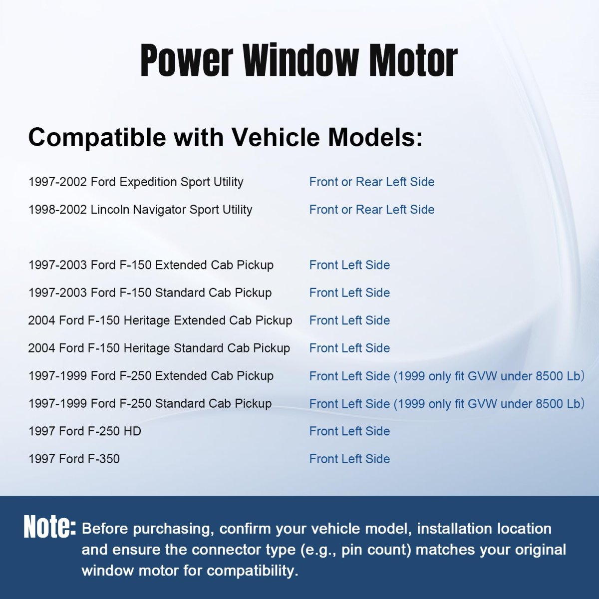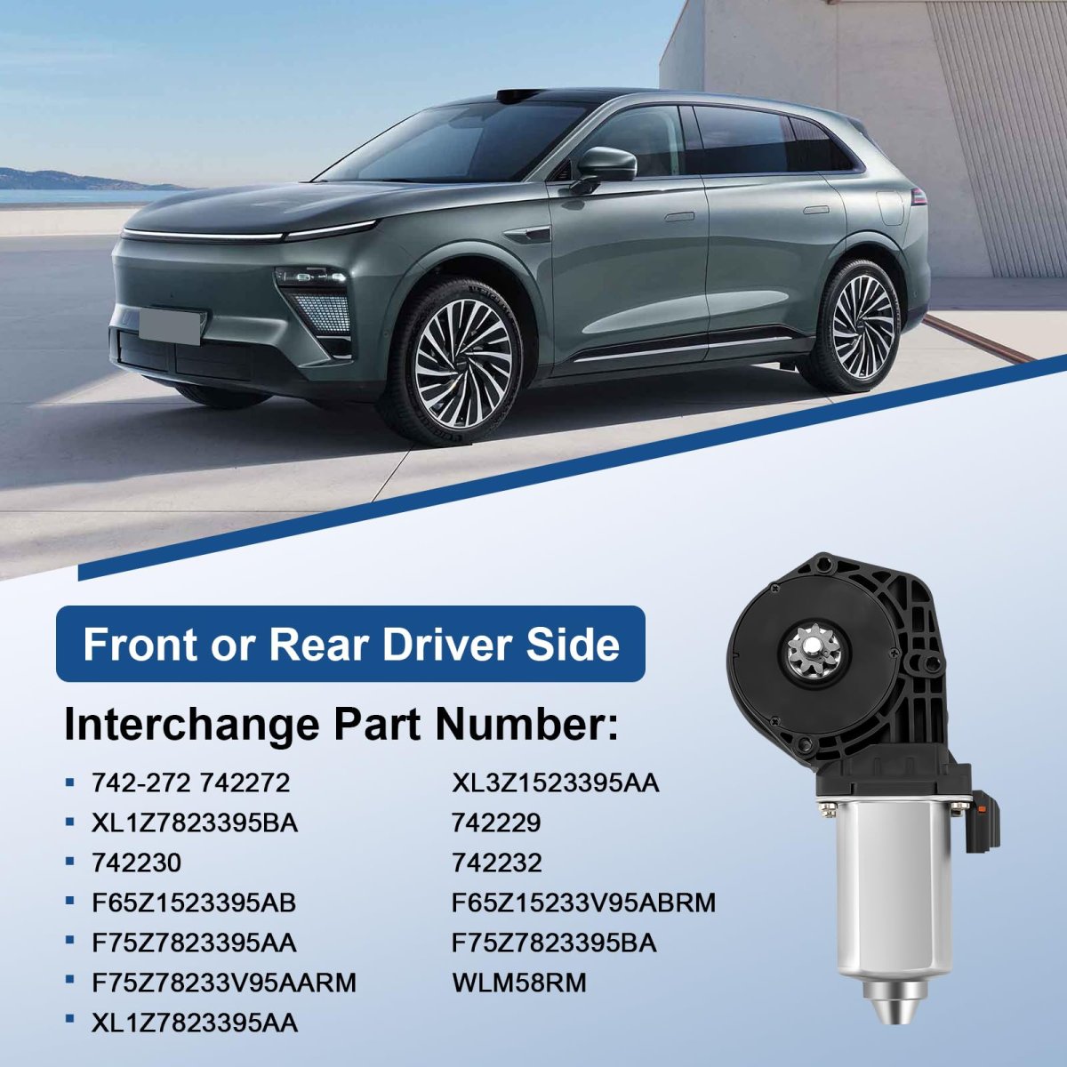 [Vehicle Fits] - Front Driver Left Side Power Window Lift Motor compatible with 1997-2003 Ford F150 Extended / Standard Cab Pickup, 2004 Ford F150 Heritage, 1997-1999 Ford F250 Extended / Standard Cab Pickup ( 1999 only fit GVW under 8500 Lb), 1997 Ford F250 HD, 1997 Ford F350. [Vehicle Fits] - Front or Rear Driver Left Side Power Window Motor compatible with 1997-2002 Ford Expedition Sport Utility, 1998-2002 Lincoln Navigator Sport Utility. [Interchange Part Number] - 742-272 742272 XL3Z1523395AA XL1Z7823395BA 742229 742230 742232 F65Z1523395AB F65Z15233V95ABRM F75Z7823395AA F75Z7823395BA F75Z78233V95AARM WLM58RM XL1Z7823395AA. [Excellent Durability & Quality] - The window motor is crafted from premium materials and rigorously tested for durability. It can prevent premature wear, striping and breakage. With a long and reliable lifespan, this product meets or exceeds OEM specifications for a perfect fit. [Strong Power & Silent Operation] - Featuring a high-performance copper wire winding motor, it delivers stable powerful torque for effortless window operation even with heavy glass. The optimized gear design significantly reduces noise, ensuring a quiet and comfortable driving experience.Other fine products