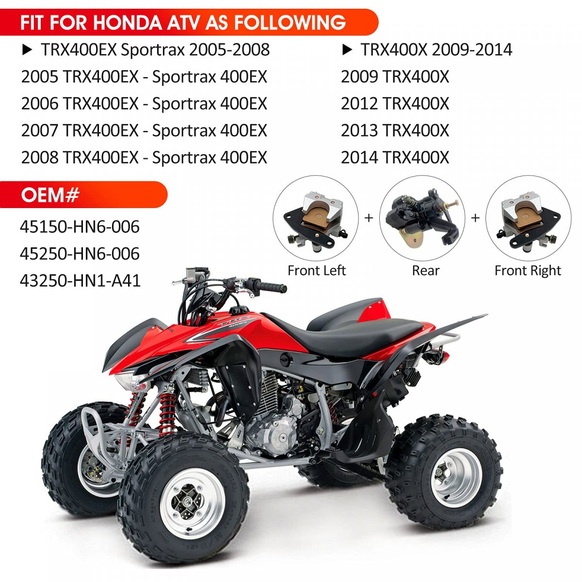 Fitment TRX400EX Sportrax 2005-2008 2005 TRX400EX - Sportrax 400EX 2006 TRX400EX - Sportrax 400EX 2007 TRX400EX - Sportrax 400EX 2008 TRX400EX - Sportrax 400EX. Fitment TRX400X 2009-2014 2009 TRX400X 2012 TRX400X 2013 TRX400X 2014 TRX400X. Feature These 3 pcs brake calipers assembly is consist of brake pads, banjos, bleeders, exact mounting brackets. Built-in precise alloy piston and anti-ageing seal kits make the caliper enhanced braking.. PackageFront Left Brake Caliper 1, Front Right Brake Caliper 1, Rear Brake Caliper 1.Other fine products