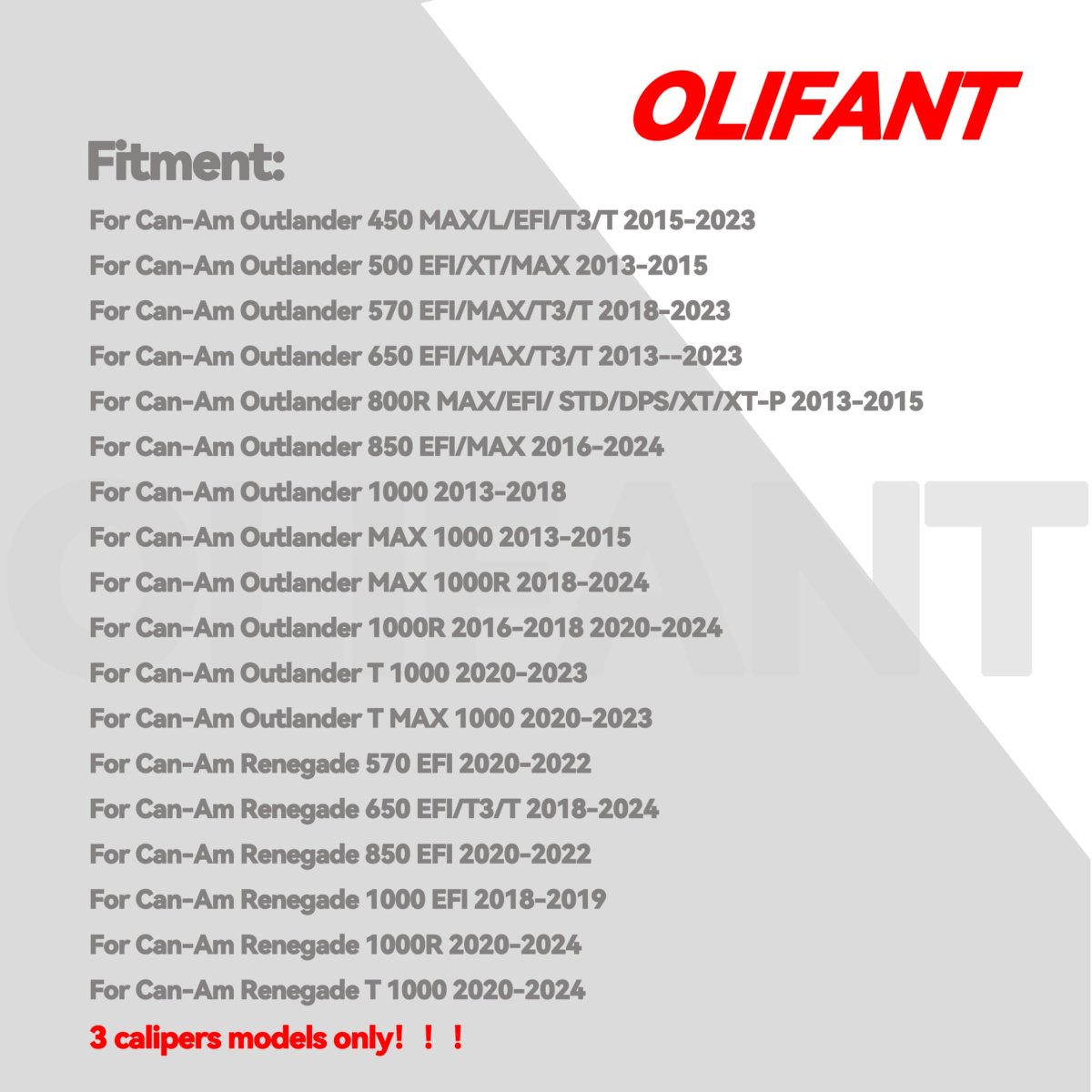 Front And Rear Brake Pads For Can-Am Outlander 450 500 570 650 800 800R 850 850R 1000 1000R MAX T 2013-2024 (3 calipers models only). Front And Rear Brake Pads For Can-Am Renegade 570 650 850 1000 1000R T 1000 2020-2024 (3 calipers models only). Feature:Made by sintered copper,high temperature resistance,stabilize braking performance and long service life.Excellent stability and durability in all harsh environments.. Part Number:705601014,705601015,715900248,715900249. Package Includes:Full set Brake Pads only for 3 calipers Models Can-Am Renegade Outlander (2 Front, 1 Rear).Other fine products