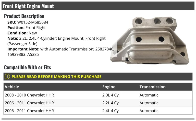 2.2L, 2.4L 4-Cylinder; Engine Mount; Front Right (Passenger Side). with Automatic Transmission. Compatible with or fits: 2008 - 2010 Chevrolet HHR 2.0L 4 Cyl Automatic. Compatible with or fits: 2006 - 2011 Chevrolet HHR 2.2L 4 Cyl Automatic. Compatible with or fits: 2006 - 2011 Chevrolet HHR 2.4L 4 Cyl Automatic.