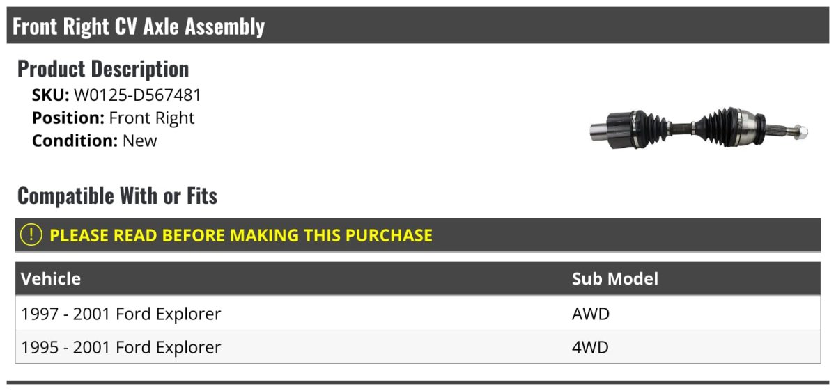 - Front Right Passenger Side Cv Axle Assembly For 1995-2001 Ford Explorer